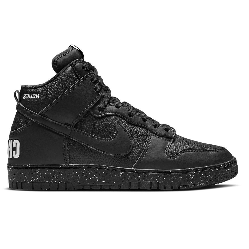 Jun Takahashi’s Neuinterpretation einer archivierten Silhouette ist simplistisch aber dennoch aussagekräftig gestaltet. UNDERCOVER’s Version des Dunk High 1985 kommt in einem Mix aus getrommelten Leder mit schwarzen Glattleder Overlays daher. Unübersehbar sind die Stickungen am hintern Kragen, welche ‘NEUES LEBEN’ und ‘NEUER LÄRM’ symbolisieren. Weitere Schriften wie ‘CHAOS’ und ‘GLEICHGEWICHT’ sind im Fersenbereich platziert worden.