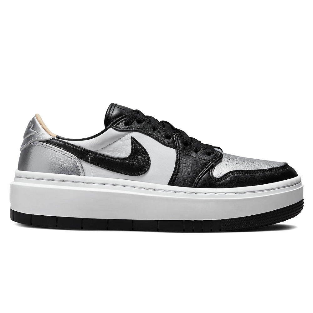 Diese Silhouette erneuert den klassischen Air Jordan 1 Low, indem sie den Schuh in einen Plateausneaker verwandelt. Das Obermaterial besteht aus weißem Leder mit silbernen Metallic-Elementen an der Zehenkappe und der Ferse. Die Overlays, der Eyestay und der charakteristische Nike Swoosh sind alle in schwarzem Leder gehalten. Das Obermaterial sitzt auf einer weißen Zwischensohle und einer schwarzen Außensohle.