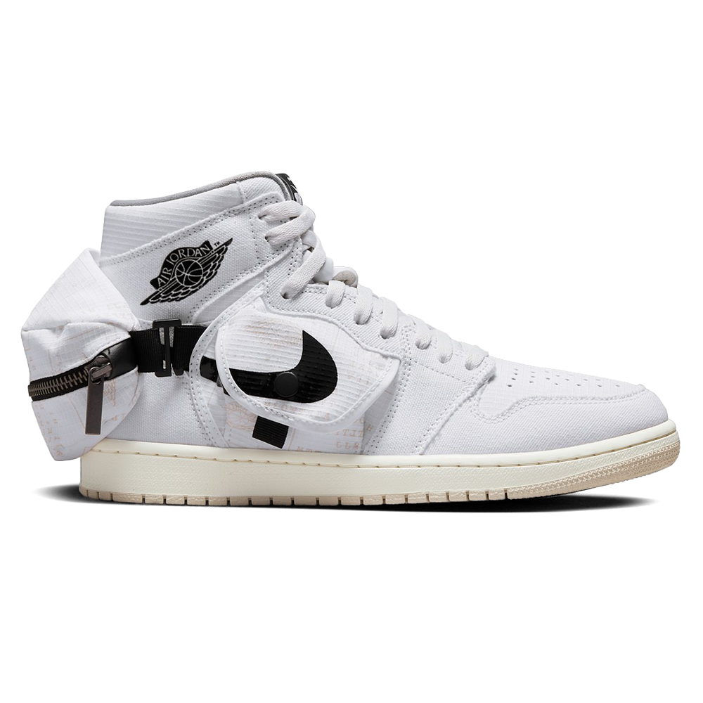 Dieser experimentelle AJ1 kommt in einem strapazierfähigen weißen Canvas. Damit die Silhouette den gewissen Tech-Flair erhält wurden diverse Verstaumöglichkeiten in From von Taschen, sowie gewebte Details dem Schuh verpasst.