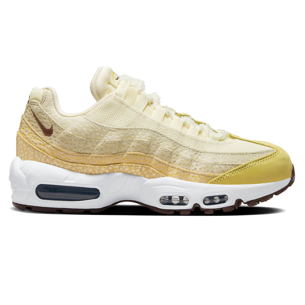 Mit Ausnahme der knallweißen Zwischensohle dominieren warme Farbtöne das Design. Das atemberaubende Gelb erstreckt sich über das Mesh, das Leder und eine Vielzahl von Swoosh-panels, die mit dem legendären Safari-Print von Nike versehen sind. Dunkle Brauntöne sorgen für den letzten Schliff und runden das Design entlang der Zunge, des Futterstoffes und der Laufsohle ab.