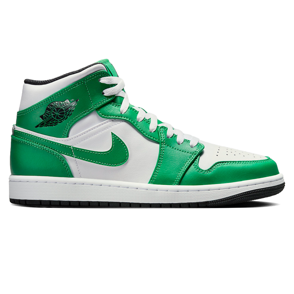 Air Jordan 1 Mid ‘Lucky Green’ Release-Date: 18.04 Mit klaren Bezügen zur Boston Celtics-Legende begeistert dieser AJ1 mit einem komplett weißen Leder-Obermaterial, das den perfekten Kontrast für das lebendige Grün bildet. Von den markanten seitlichen Swooshes bis hin zu den atemberaubenden Wings-Logos auf den Knöchelriemen – alles strahlt in einem auffälligen Grün. Selbst das Jumpman Branding auf der Zunge und die Laufsohle zeigen sich in einem tiefen Schwarz, das dem Ganzen eine extra Portion Eleganz verleiht.