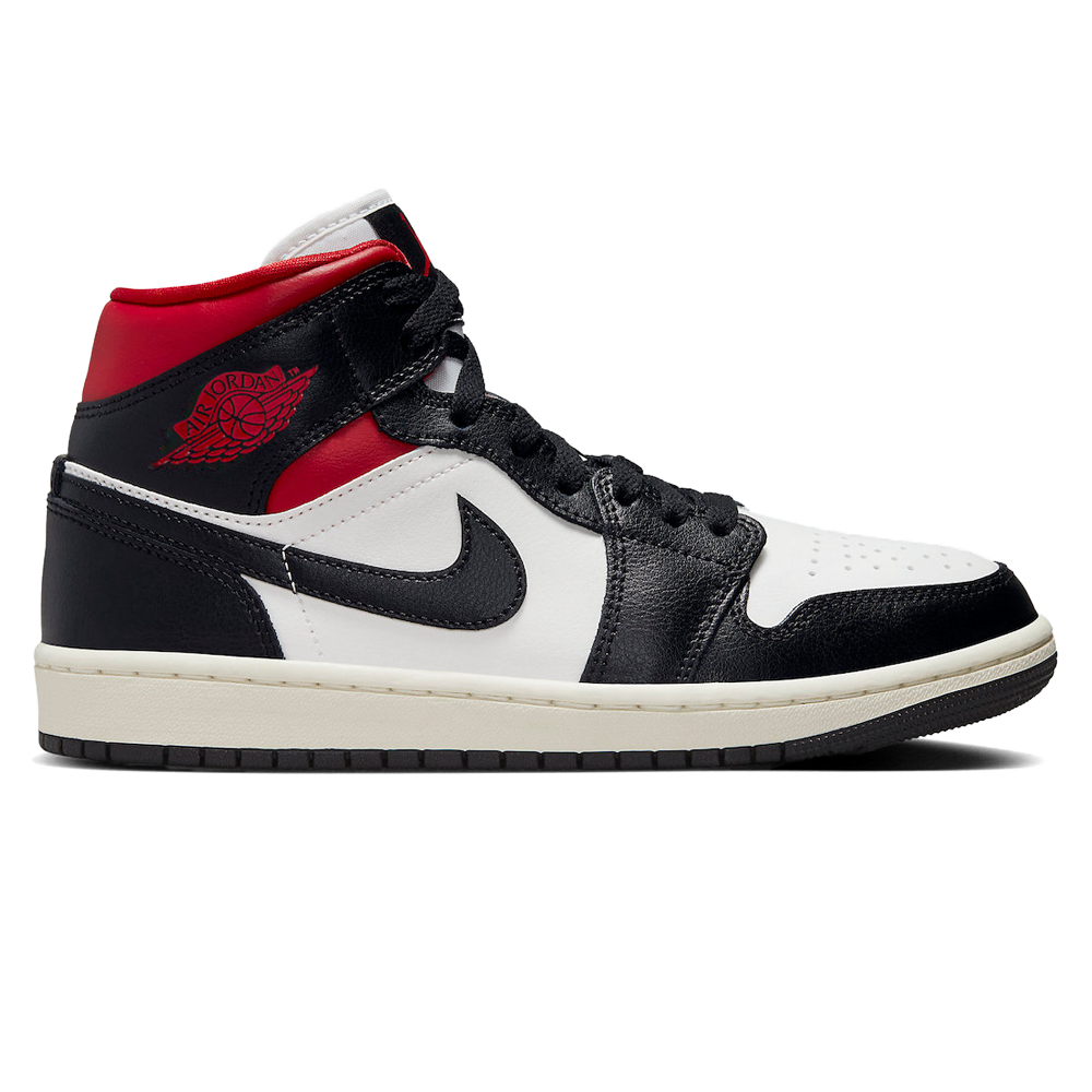 Air Jordan 1 Mid ‘Sail Gym Red Panda’ (W) Release-Date: 17.04 Der beliebte Mid-Top-Jordan präsentiert sich mit lebendigen weißen Lederoberflächen, die die perforierten Zehenkappen und Viertelpaneele schmücken. Schwarze Lederpaneele setzen Akzente auf den Mudguards, Schnürsenkeln, Swooshes an den Seiten, Fersenverstärkungen und Knöchelklappen. Letztere sind mit dem ikonischen Wings-Logo des Sneaker-Giganten in einem markanten Gym Red-Ton verziert. Rote Akzente ziehen sich auch entlang der Kragen, der Mesh-Futter, der Einlegesohlen und der Jumpman-Figuren auf den Zungen-Tags. Die Sail farbende Zwischensohlen komplettieren das Angebot neben schwarzen Gummisohlen. Die klassischen Farben dieses Sneakers machen ihn ideal für jeden Anlass, sei es auf oder abseits des Basketballplatzes.