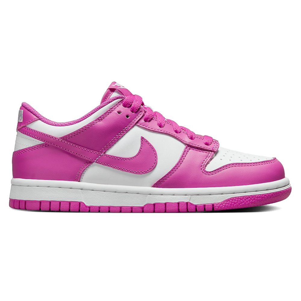 Nike Dunk Low GS ‘Active Fuchsia’ Release-Date: 17.04 Der Nike Dunk Low GS ‘Active Fuchsia’ bringt ordentlich Schwung in die Sneaker-Szene! Mit seiner explosiven Farbkombination aus strahlendem Weiß und leuchtendem Pink ist dieser Sneaker definitiv ein Hingucker, der alle Blicke auf sich zieht. Das glatte Leder-Obermaterial verleiht dem Schuh eine edle Optik, während die markanten schwarzen Überzüge an den Mudguards, Schnürsystemen, Swooshes, Fersenkappen und Knöchelklappen für einen aufregenden Kontrast sorgen. Das legendäre Wings-Logo von Nike in leuchtendem Gym Red auf der Knöchelklappe setzt ein unverwechselbares Statement. Auch im Inneren des Schuhs setzen rote Akzente an den Kragen, Mesh-Futter, Einlegesohlen und Zungen-Tags zusätzliche Highlights. Die weiße Sail-Mittelsohle rundet das Design ab und harmoniert perfekt mit der schwarzen Gummilaufsohle. Dieser Sneaker ist ein absoluter Klassiker und eignet sich perfekt für jede Gelegenheit, sei es auf dem Basketballplatz oder im Alltag!