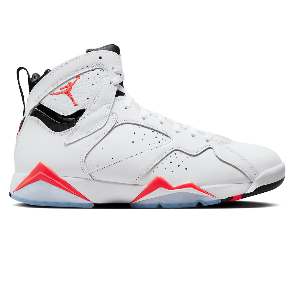 Air Jordan 7 Retro ‘White Infrared’ Release-Date: 30.06 Lass dich verzaubern von dem legendären Air Jordan 7 Retro ‘White Infrared’. Dieser Sneaker präsentiert das vertraute OG-Farbschema, das ursprünglich auf dem Air Jordan 6 zu sehen war. Das mehrschichtige Obermaterial besteht aus weißem Leder mit perforierten Details im Mittelfußbereich und am Kragen. Letzterer ist mit einem Infrared Jumpman-Logo auf der seitlichen Seite verziert, das perfekt zu der ‘Air Jordan’-Schriftzug auf der dehnbaren Neoprenzunge passt. Eine geformte ’23’-Applikation ziert die Ferse, während das klassische Nike Air-Branding auf dem Einlegesohle erscheint. Eine weiße Zwischensohle bietet leichte Dämpfung und wird durch eine durchsichtige Gummilaufsohle verstärkt.