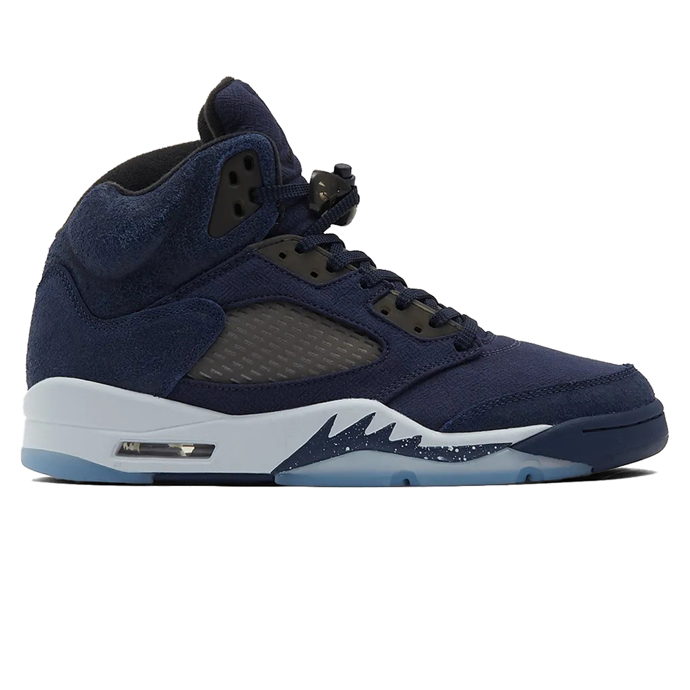 Air Jordan 5 Retro ‘Midnight Navy’ Release-Date: 10.11 Der Air Jordan 5 Retro SE ‘Midnight Navy‘ präsentiert ein einfarbiges Finish auf dem Obermaterial aus Textil und Wildleder, ausgestattet mit einem gepolsterten Kragen und atmungsaktivem Netzgewebe im Viertelbereich. Geformte schwarze Ösen passen zu den Jumpman-Logos, die die Zunge und die Ferse zieren. Der Sneaker ruht auf einer weißen-Zwischensohle mit gesprenkelten Haifischzahn-Details und einer sichtbaren Air-Sole-Einheit in der Ferse. Unterhalb sorgt eine blaue, transparente Gummilaufsohle mit einem Rautenprofil für optimalen Grip.