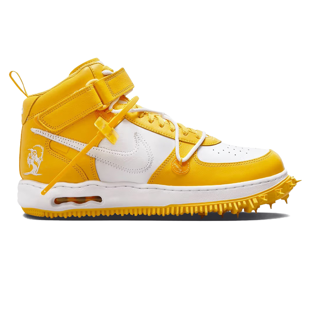 Nike Air Force 1 Mid SP Leather Off-White ‘Varsity Maize’ Release-Date: 09.11 Der Nike Air Force 1 Mid SP Leather Off-White ‘Varsity Maize’ aktualisiert das klassische Modell mit einem umgestalteten Design, das durch eine wellige Zwischensohle mit sichtbarer Air-Sohlen-Dämpfung und eine gummiartige Spike-Außensohle hervorgehoben wird. Das zweifarbige Leder-Obermaterial in Weiß und Gelb wird mit einer herkömmlichen Schnürung gesichert, ergänzt durch ein zusätzliches Schnürsystem, das durch sichtbare Flywire-Kabel verläuft. Zusätzlich zu einem weißen Lederswoosh, umrandet von tonalem Zickzack-Naht, sind zu den Branding-Elementen auch Off-White-Text auf dem medialen Seitenteil und eine Grafik des Sensenmanns gestickt auf der lateralen Ferse.