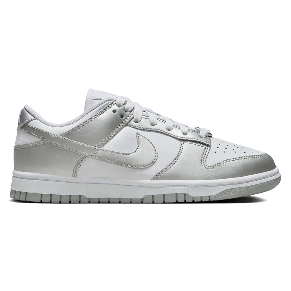Nike Dunk Low ‘Metallic Silver’ (W) Release-Date: 09.11 Während metallische Oberflächen normalerweise als Hintergrundakzente in den umfangreichen Lifestyle-Archiven von Nike dienen, taucht der neueste Nike Dunk Low direkt in eine glühende Metallschmelze ein. Nachdem er aus seinem Bad in der flüssigen Metalllegierung zurückgekehrt ist, kleidet das von Peter Moore entworfene Design seine Überlagerungen und die Profilswooshes in die schimmernde Silberbehandlung mit geschmolzenen Dubraes. Frisches Weiß kontrastiert viele der ergänzenden Verzierungen, und bietet eine weiße Leinwand für die glänzenden Seitenteile. Farblose geprägte Zungenlaschen verleihen dem monochromen Ensemble einen Hauch von Premium-Ästhetik, während eine unerwartet gekleidete ‘Blue Joy’-Innensohle einen versteckten Farbakzent aus der Farbpalette einbringt.