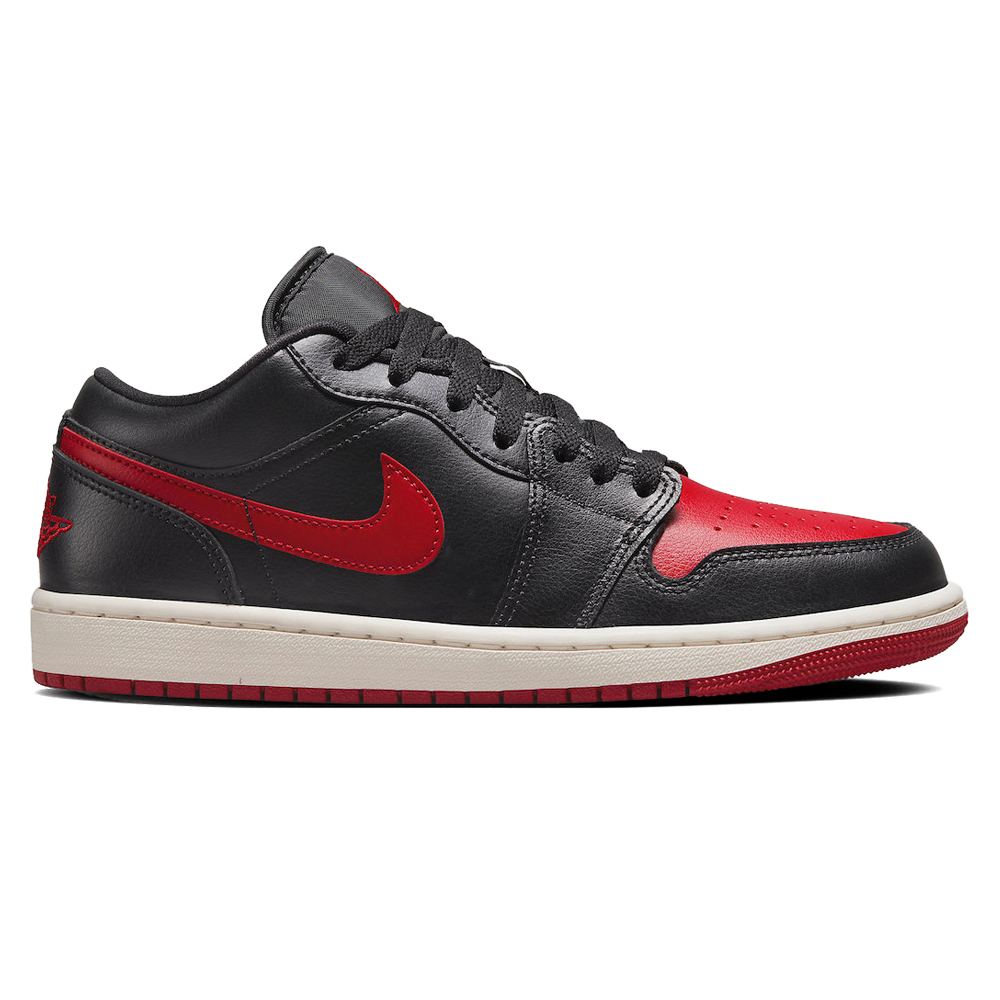 Air Jordan 1 Low ‘Bred Sail’ (W) Release-Date: 04.05 Das neueste Air Jordan 1-Modell zollt dem Original von 1985 Tribut und präsentiert den legendären roten Swoosh auf schimmerndem Leder an der Vorderkappe. Die übrigen Tumbled-Paneele und Overlays sind in dunklem Schwarz gehalten und nur das gestickte Flügel-Logo an der Ferse und der Jumpman auf der Zunge brechen die zurückhaltende Optik. Die schwarzen Schnürsenkel und Sockenliner fügen sich nahtlos in das düstere Design ein. Für einen Hauch von Kontrast sorgt die cremefarbene Zwischensohle, die anstelle des gewöhnlichen Weißes zum Einsatz kommt, während die rote Sohle das Design perfekt abrundet.