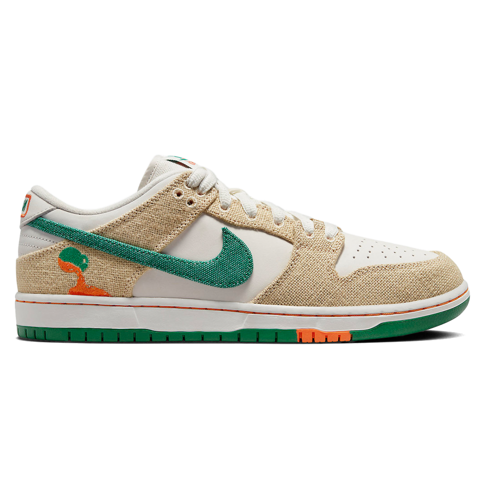 Release-Date: 06.05 Die SB Dunk Low Jarritos präsentiert ein gemeinsames Design, das von der beliebten mexikanischen Limonade-Marke inspiriert ist. Der Schuh vereint eine weiße Lederbasis mit Hanf-Canvas-Overlays und einem grünen textilen Swoosh. Das Jarritos-Logo ist in Grün und Orange auf der lateralen Ferse gestickt, während die gewebte Zungenlasche mit einem Dual-Branding versehen ist. Verschiedene Fersenteile sind mit ‘Nike’ und ‘Jarritos’ auf dem linken und rechten Schuh verziert. Die robuste Gummisohle verankert den Sneaker und kombiniert weiße Seitenwände mit einer zweifarbigen grün-orangefarbenen Außensohle für einen aufregenden Look.