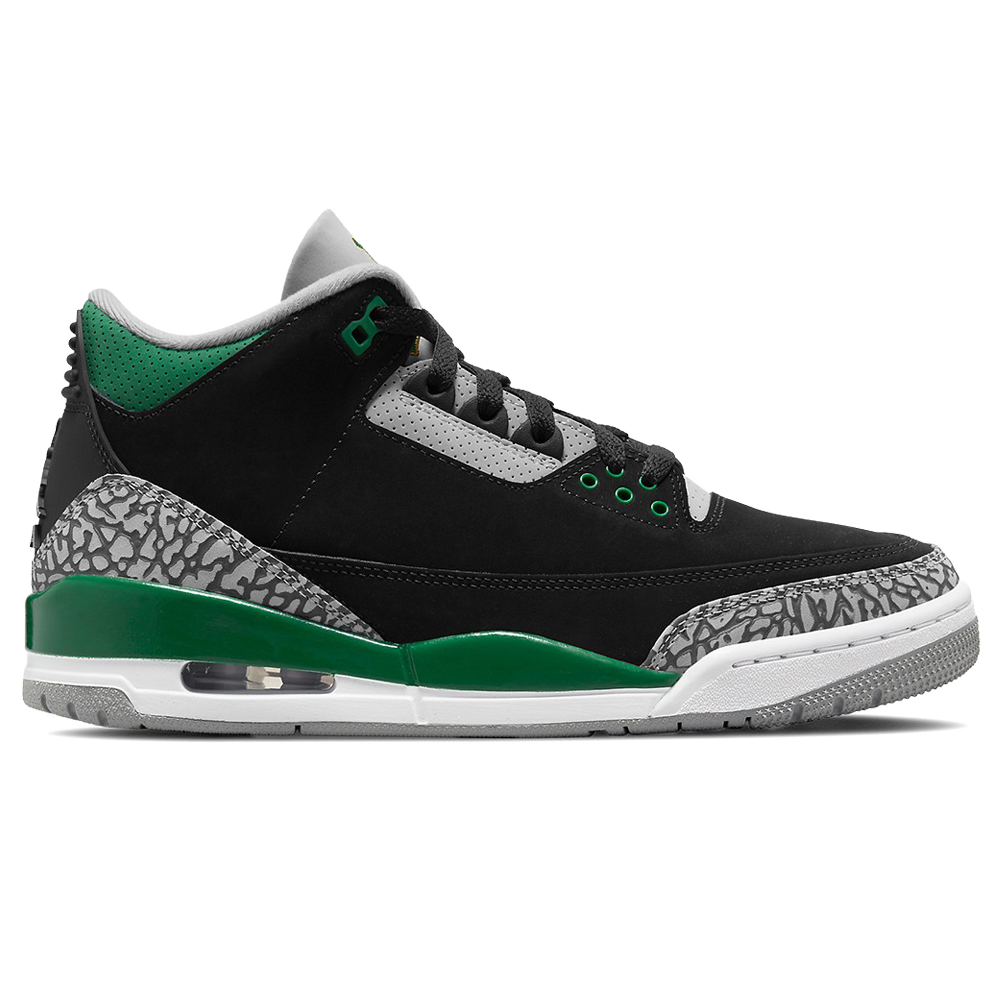 Die zementbedruckten Overlays bleiben in ihrem gewohnten grau-schwarzen Outfit, während Nuancen von Pine Green auf dem Kragen, dem Innenfutter, den Jumpman-Logos auf der Zunge, der Zwischensohle und den Ösen auftauchen. Weitere Grautöne werden auf der Zunge, dem Hals und dem Jumpman-Branding an der Ferse verwertet, wobei letzteres von einer schwarzen Fersenkappe überlagert wird. Darüber hinaus macht ein Hauch von Gold auch seine Präsenz spürbar.